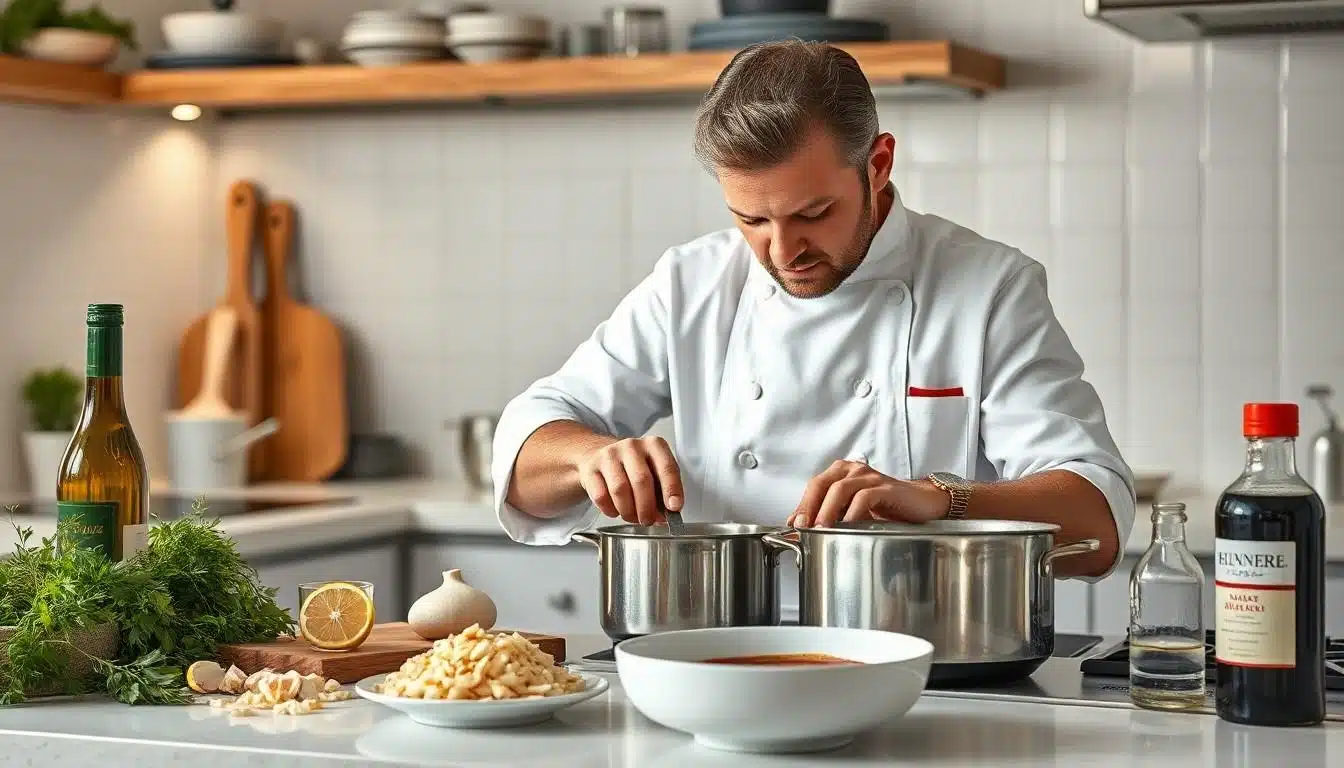 Les ustensiles de base incluent : une casserole antiadhésive, un fouet, un couteau d’office, une planche à découper et une louche. Un chinois pour filtrer la sauce est également recommandé.